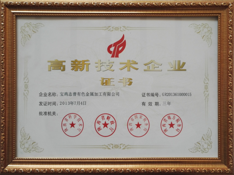 2013年7月,寶雞志普有色金屬加工有限公司被陜西省科學(xué)技術(shù)廳、陜西省財(cái)政廳、陜西省國家稅務(wù)局、陜西省地方稅務(wù)局聯(lián)合授予高新技術(shù)企業(yè)并頒發(fā)證書。
