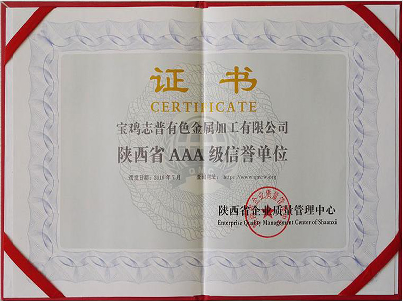 2016年7月,寶雞志普有色金屬加工有限公司被陜西省質(zhì)量管理中心授予陜西省AAA級信譽單位。
